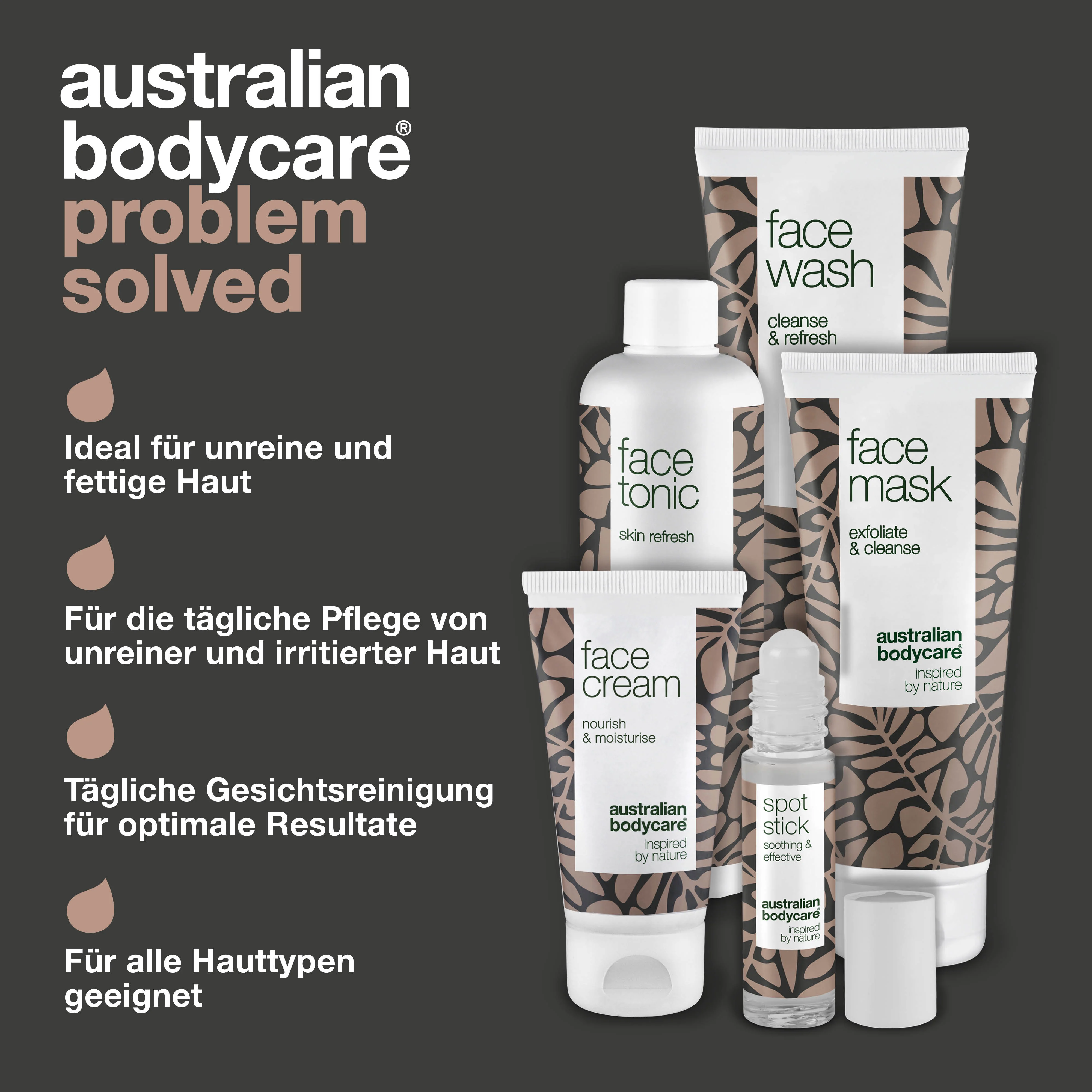 Das Paket besteht aus dem Face Wash 100 ml, Face Mask 100 ml, Face Tonic 150 ml, Face Cream 50 ml und dem Spot Stick 9 ml.