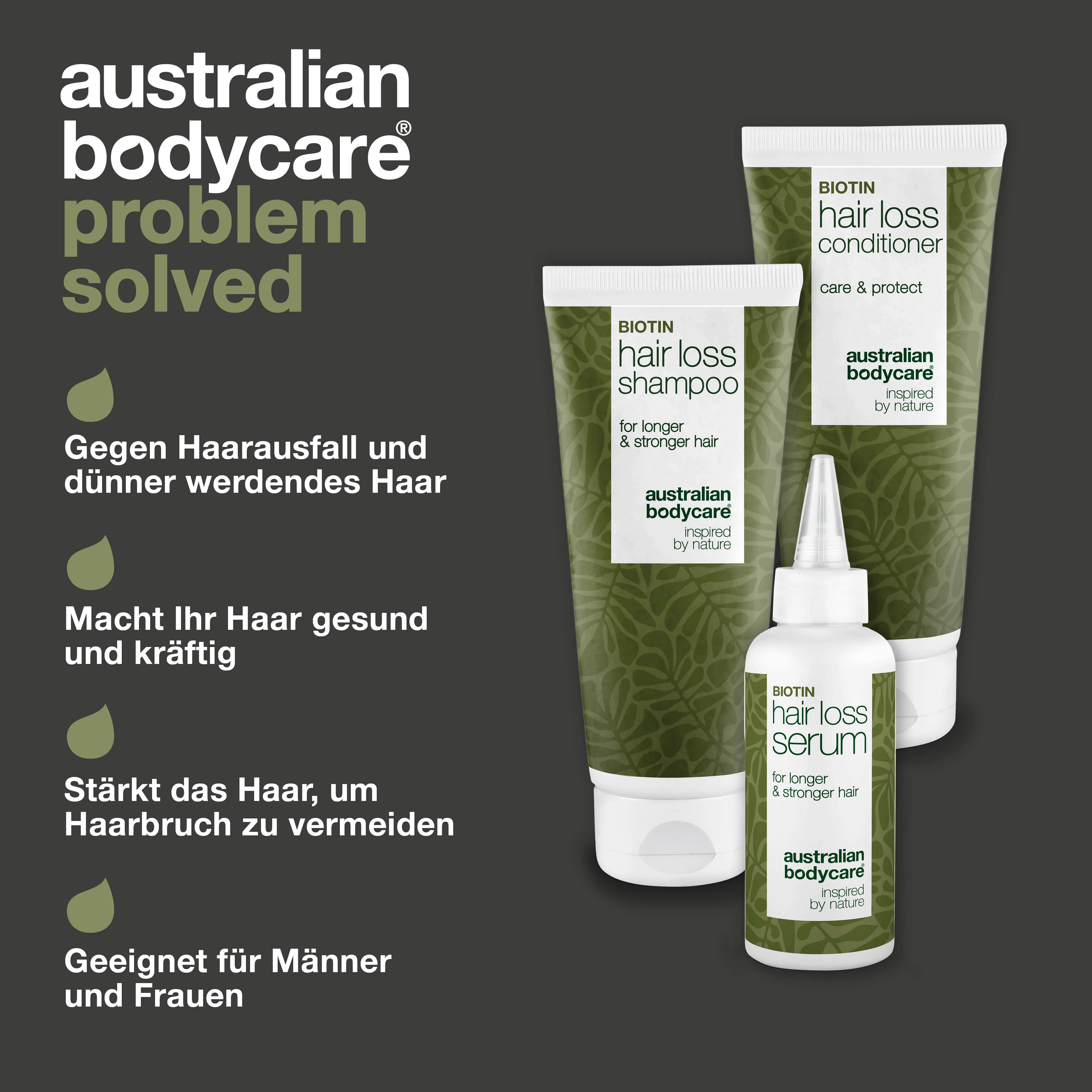 3 Produkte für die ideale Pflege von langem und starkem Haar | Für Männer wie Frauen geeignet | Enthält natürliche und nützliche Wirkstoffe – ideal bei Haarausfall und -ausdünnung | Enthält die Wirkstoffe Teebaumöl, Biotin und Capilla Longa | Für mehr Volumen und Kraft bei dünnem und feinem Haar.