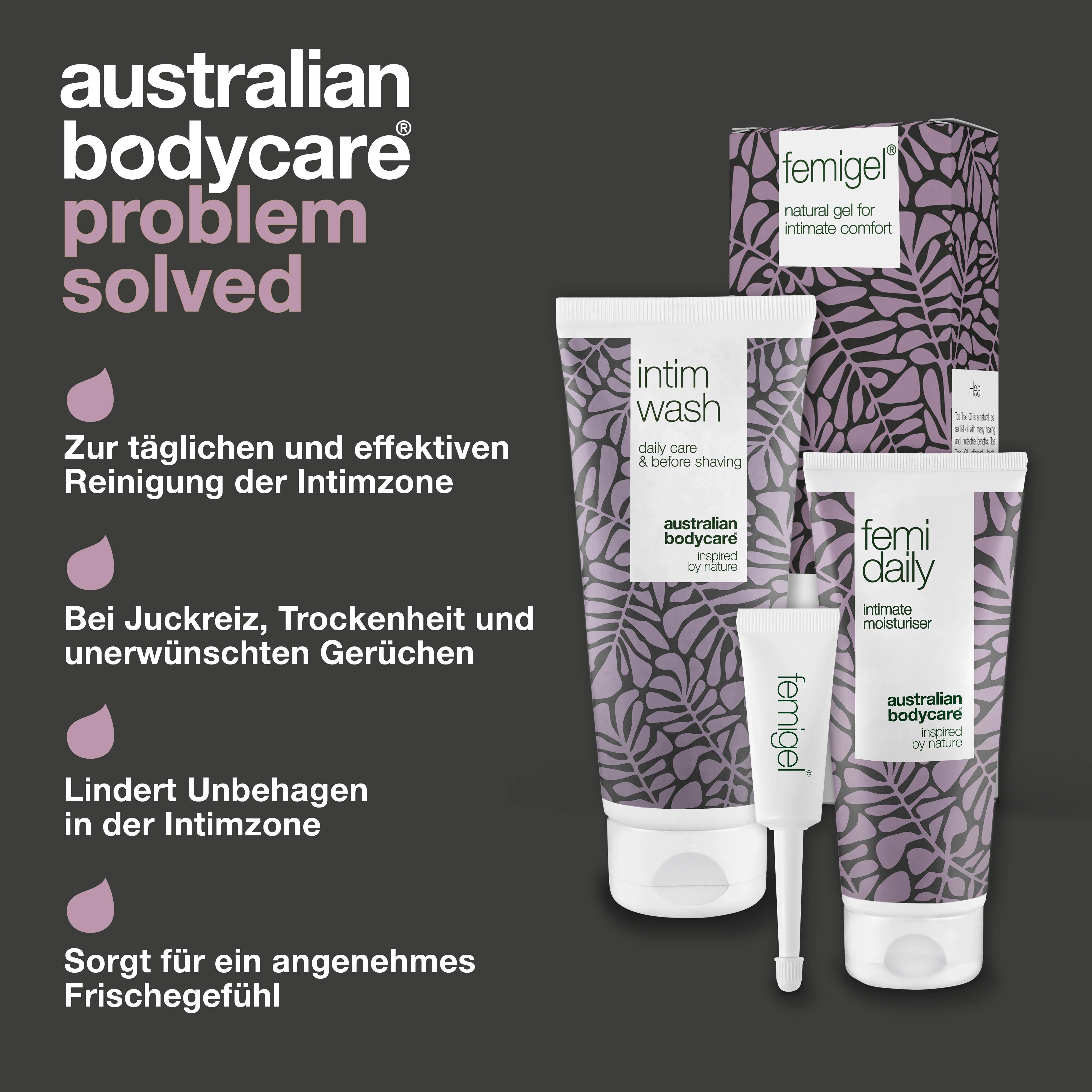 Australian Bodycare 3er Intimpflege Set fĂĽr Frauen mit Juckreiz, Trockenheit & unerwĂĽnschten GerĂĽchen im Intimbereich | Waschlotion Intim Wash 200ml, Vaginalgele Femi Daily 100ml & Femigel 5x7ml.