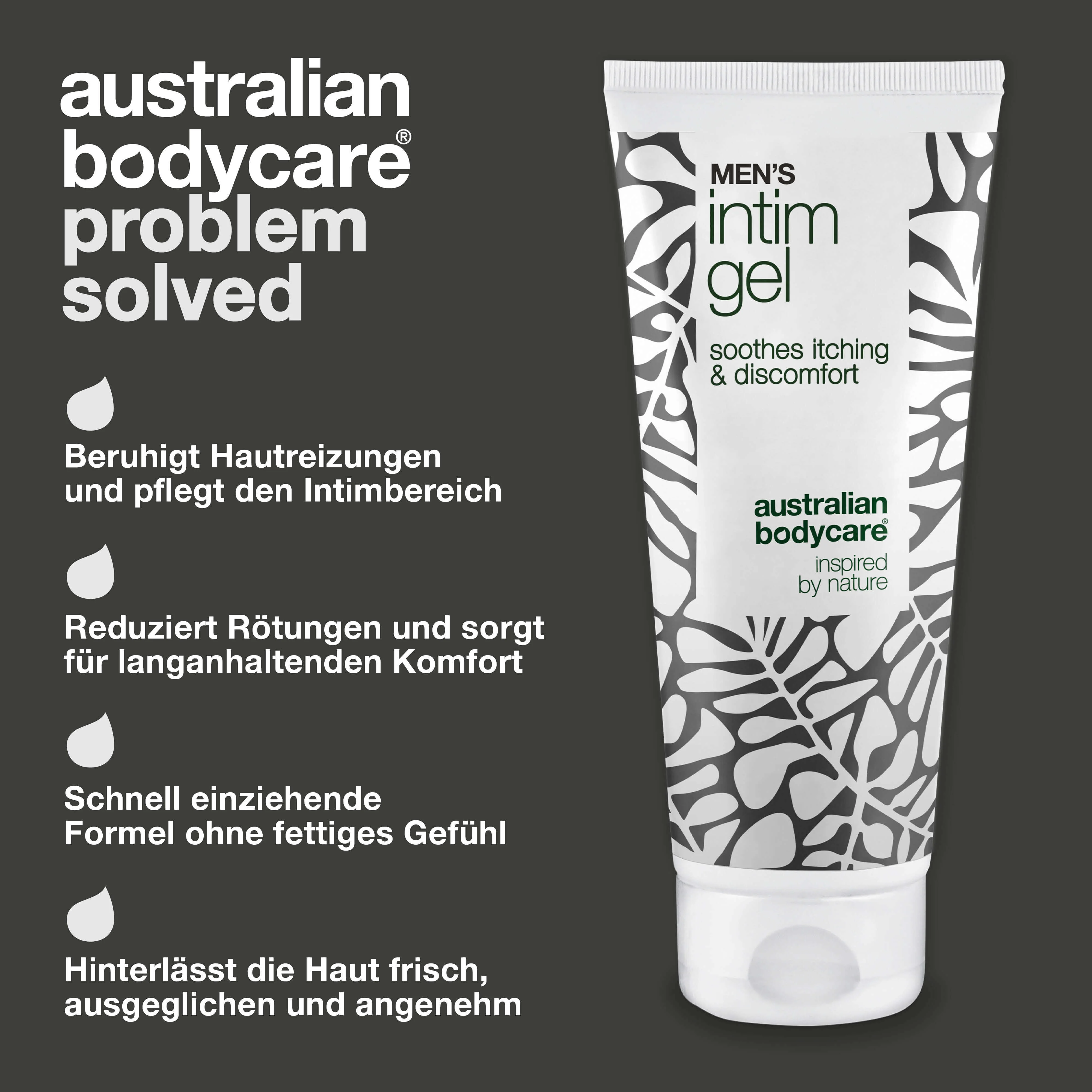 Die einzigartige Formel von Men’s Intimate Gel schützt und pflegt die empfindliche Haut rund um den Penis und die Leistengegend. Das Gel enthält natürliches 4-Terpineol, ein aktiver Inhaltsstoff, der aus Tea Tree Oil bekannt ist, und hilft, die Haut sauber und frei von Bakterien zu halten – einer der Hauptgründe für Juckreiz und Hautreizungen.