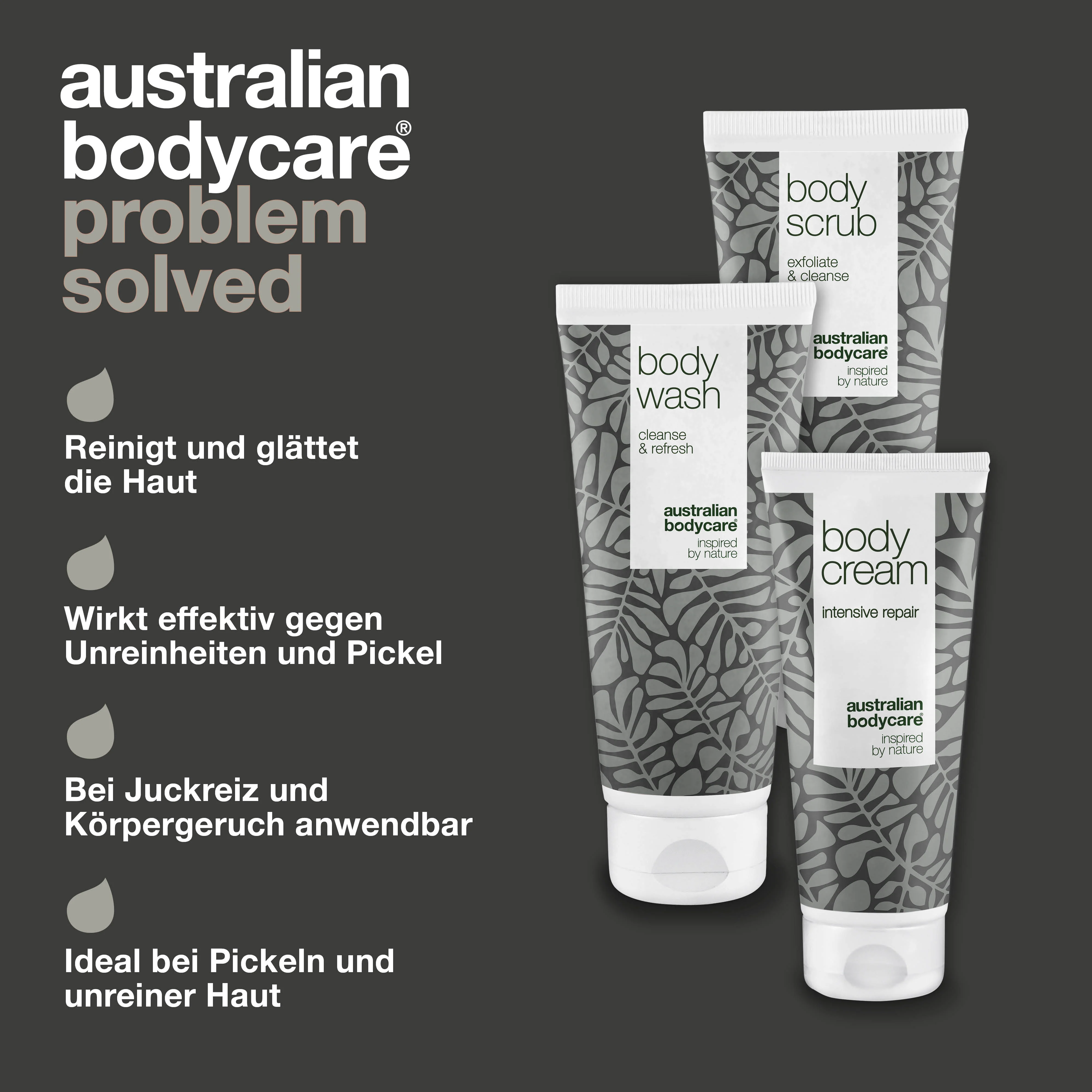 3 Produkte, die pflegen, reinigen und Feuchtigkeit verleihen, und die gegen Juckreiz wirken | Gut geeignet bei sehr trockener und juckender Haut am Körper | Kann auch zur Pflege bei Neurodermitis und Pilz verwendet werden. Das 100% natürliche, australische Teebaumöl wirkt gegen Bakterien, hat eine reinigende Wirkung, und hält die Haut sauber.