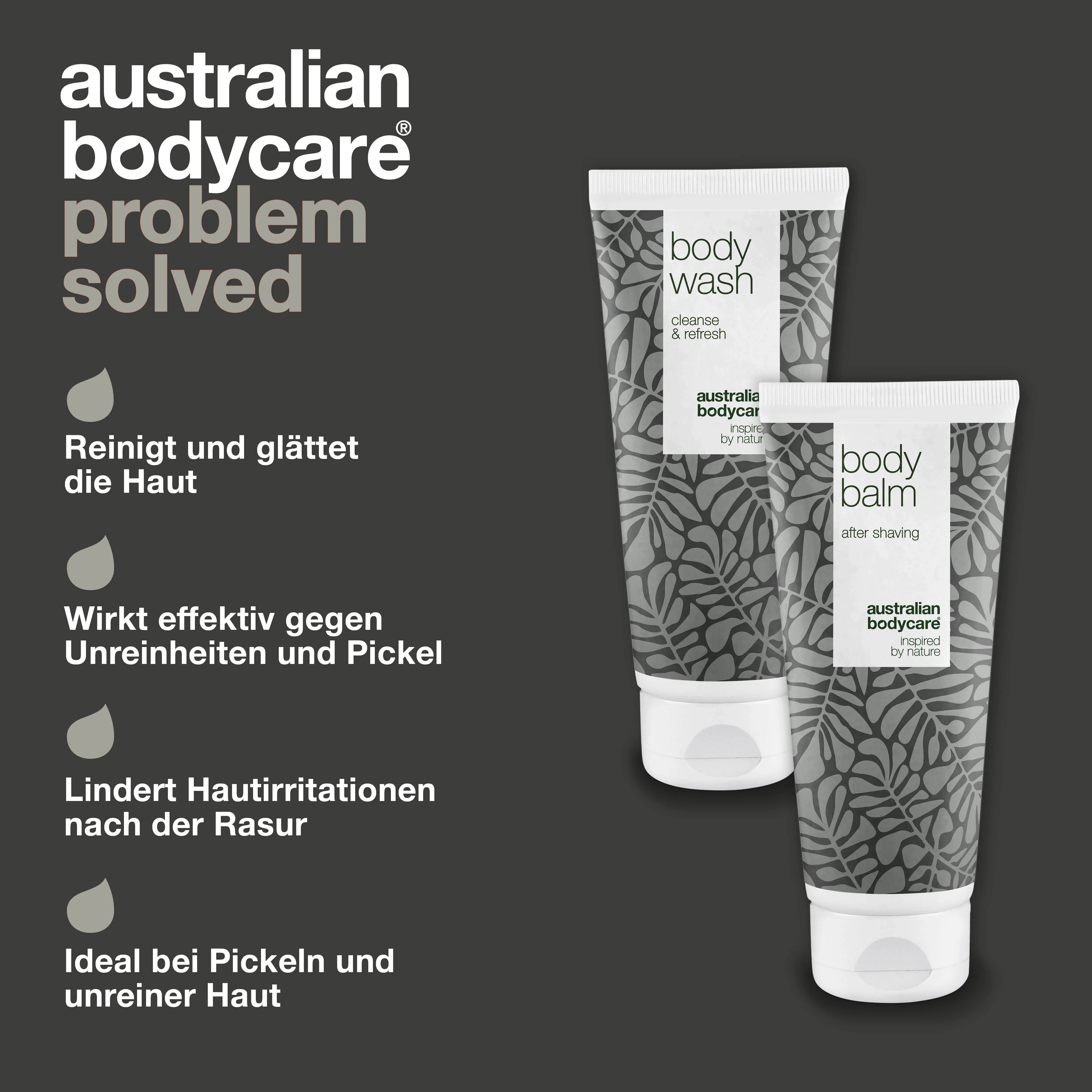 Probleme mit roten Pickeln nach der Rasur unter den Armen? 2 Produkte gegen Hautprobleme nach der Rasur | Body Wash reinigt die Haut vor der Rasur, während Body Balm die Haut pflegt und nach der Haarentfernung lindert | Verhindert und reduziert Hautprobleme nach der Rasur | 100% natürliches Teebaumöl wirkt gegen Bakterien.