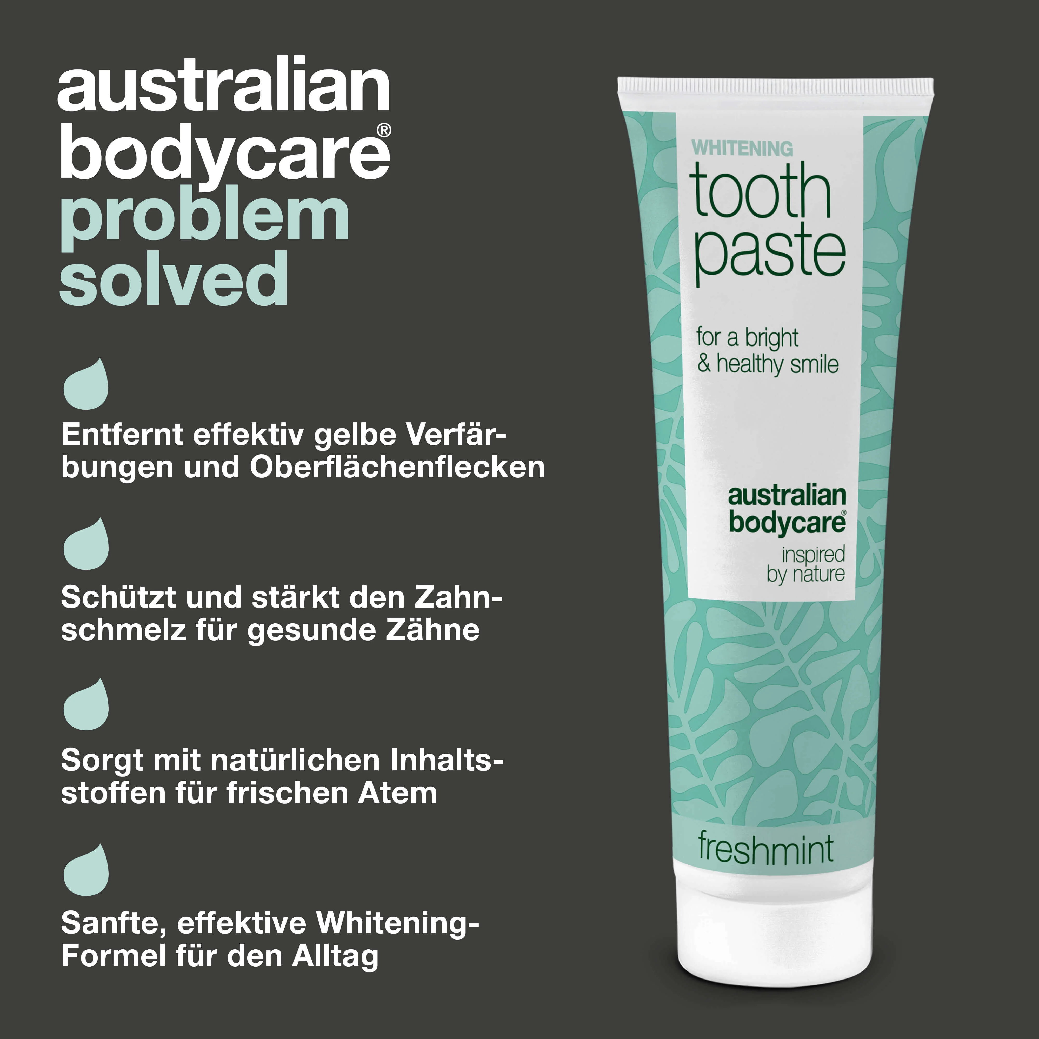 "Wir haben diese einzigartige Whitening-Zahnpasta inspiriert von der Natur entwickelt, um dir eine effektive, aber schonende Möglichkeit zu bieten, weißere Zähne zu bekommen. Die Kombination aktiver Wirkstoffe sorgt für sichtbare Ergebnisse und unterstützt gleichzeitig deine Mundgesundheit."